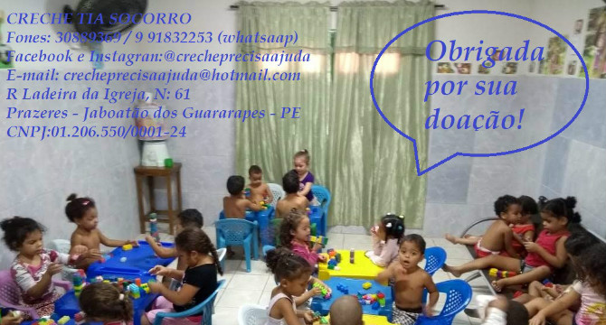 No dia 07 de novembro ocorreu em nossa creche um incêndio onde destruiu todo o berçário, cozinha e uma das salas. Graças a Deus as crianças já haviam saído e não houve feridos. A creche foi reformada em dezembro/2018 com a ajuda de muitas pessoas e empresas. Mas nossa necessidade é diária para manter as crianças aqui.